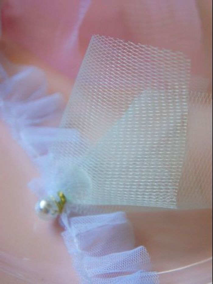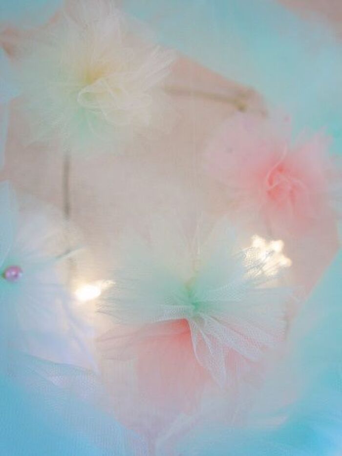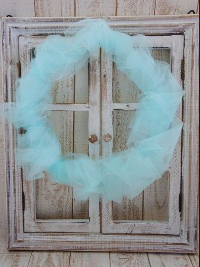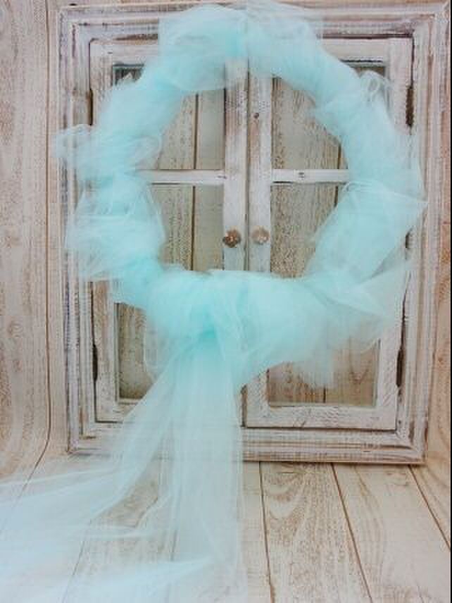 ※こちらの制作に使用したチュール布は約150㎝巾の品物を3m購入し、巾をまず半分にカットし2枚の細長い布にしました。その1枚は円形土台に巻きつけ、もう1枚は垂らし布やフェアリーパーツ作りにして使い切りました。使用分量の目安になればと思い記しておきますね。