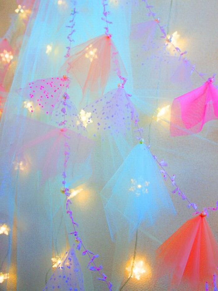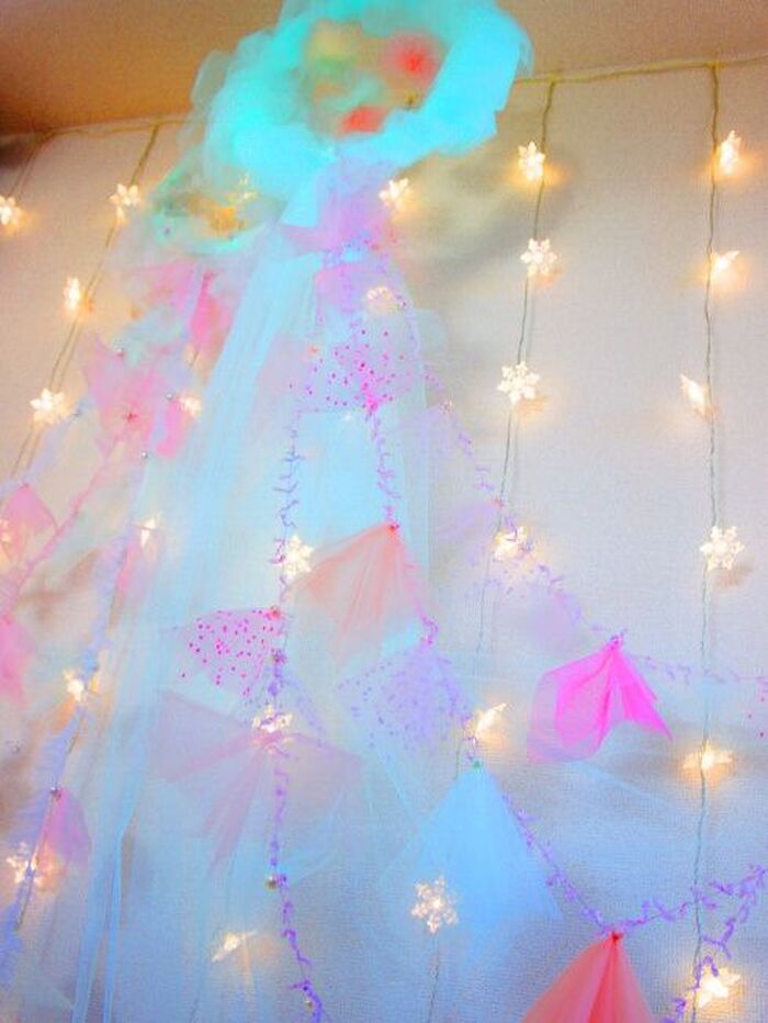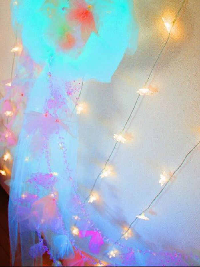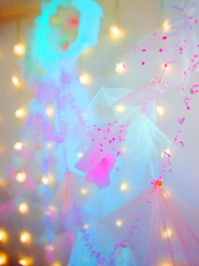 透明なテグスを吊るしヒモにして、夜空の宙にフワフワ浮かんだ雰囲気で飾ってみるのもいかがでしょうか^^