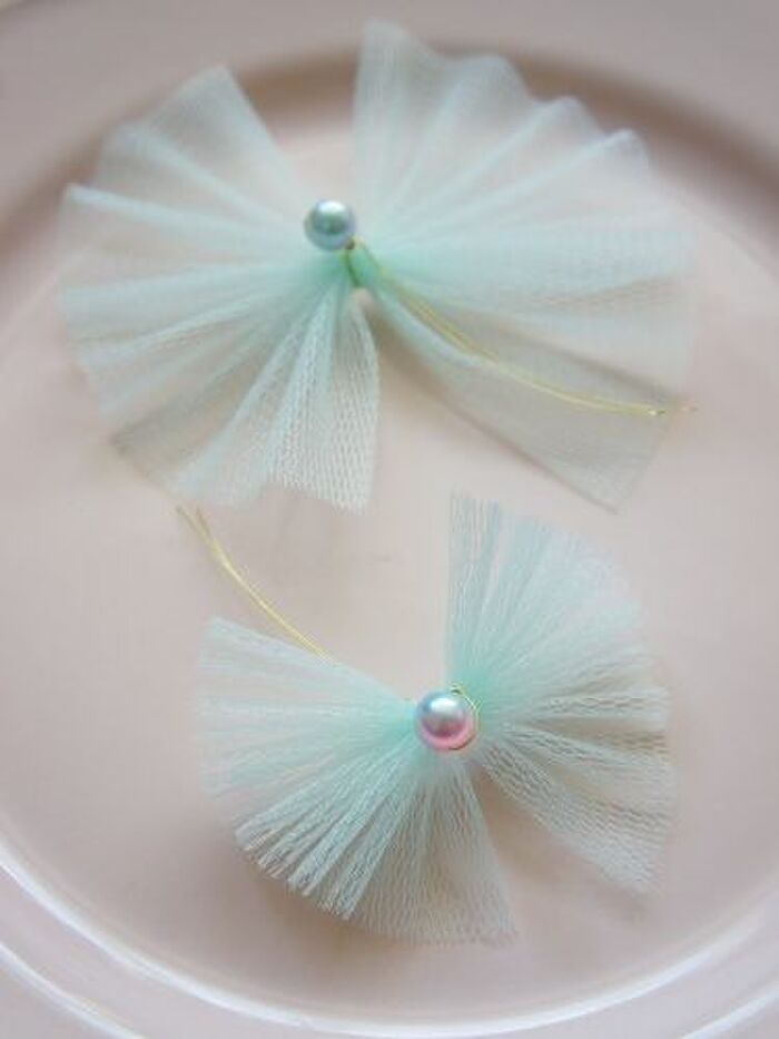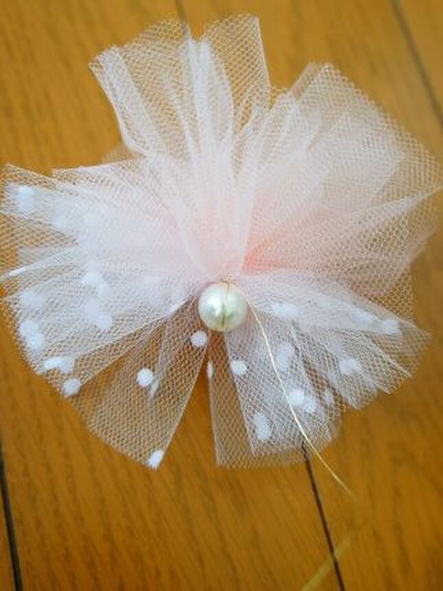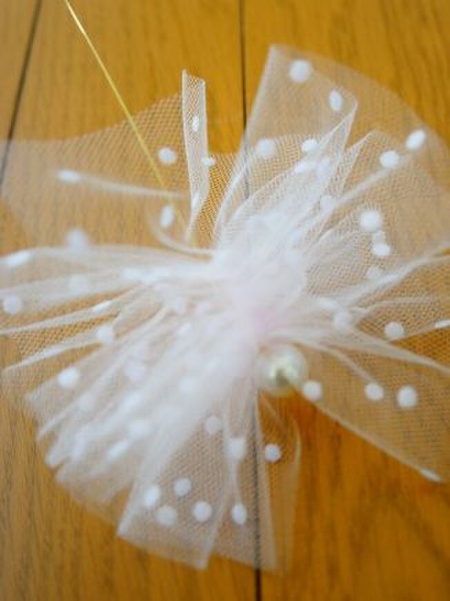 フリルテープにワイヤーをくくり留めて、フェアリーパーツを固定します。