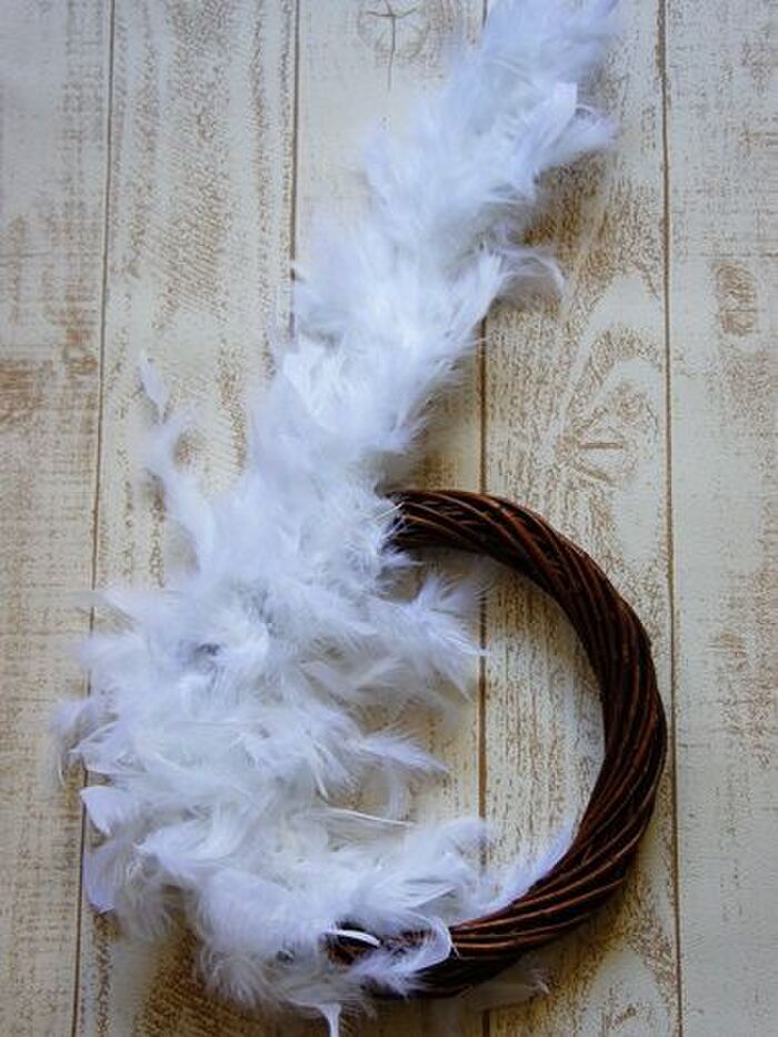 用意する品物は、リースの土台と羽マフラー(2枚)。 ※どちらもDAISOさんにて購入。