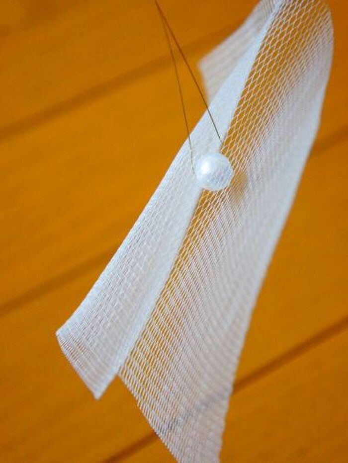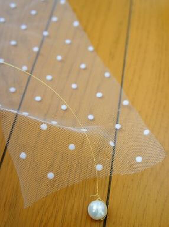 端にビーズを通してねじり固定したワイヤー(長さ約20㎝)を、チュールの中央の端からなみ縫いするように順々に通し、