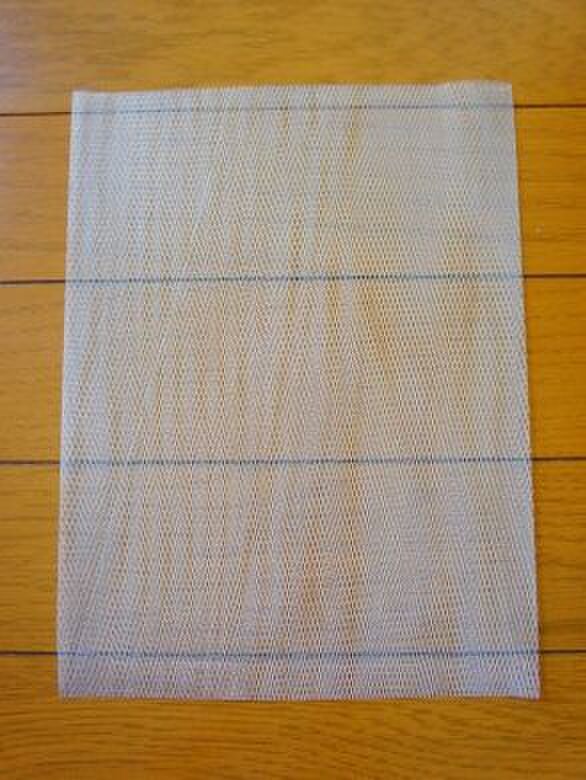 四角くカットしたチュールを、水切りネットの工程と同様に制作すると上写真のような雰囲気に。 ※すごく薄いチュール布の場合は、2重仕立てにして制作。