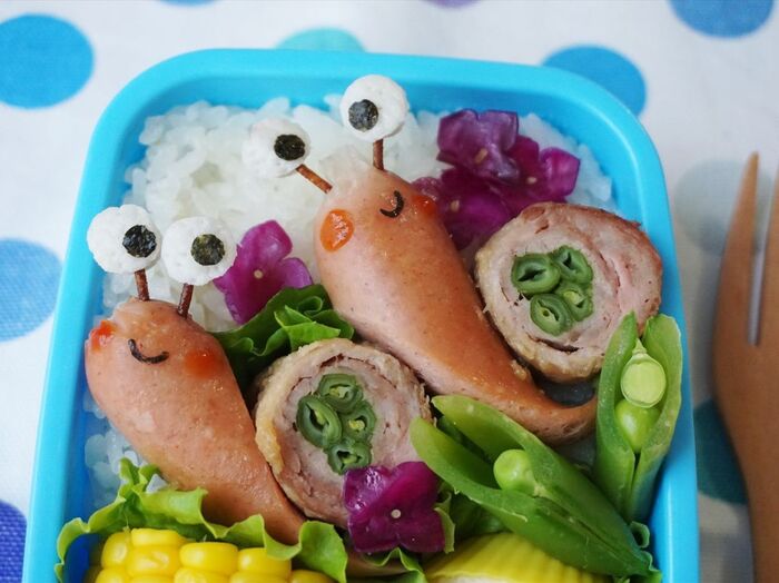 おかずを利用してかたつむりを作っています。その分、おかずの内容や詰め方はプラスマイナスしてくださいね♪