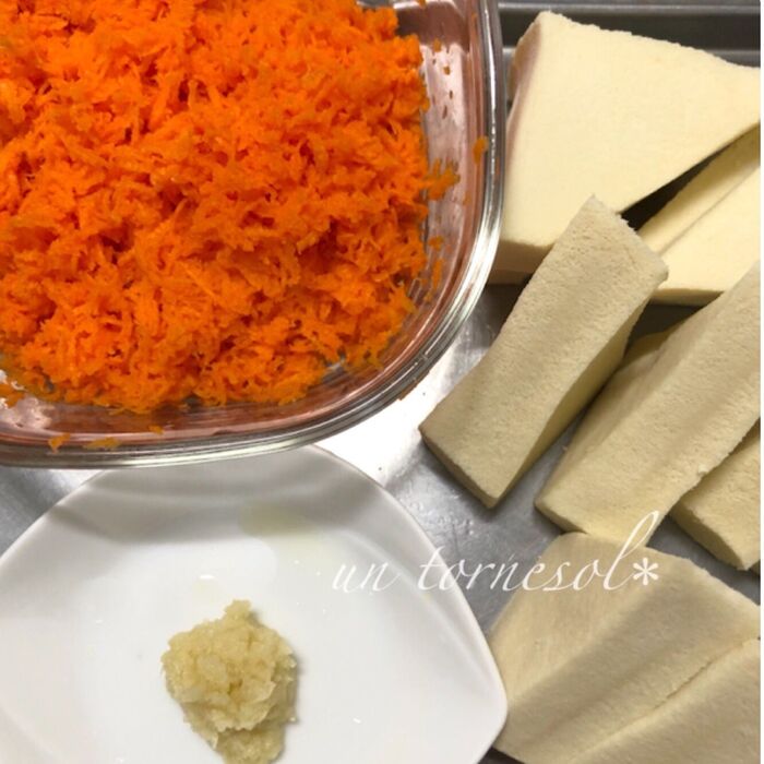 にんじんはすりおろし、高野豆腐はしっかりと絞ってから4等分に切り、しょうがはすりおろす。
