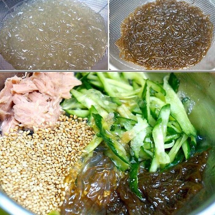 もずく(70gを使用)もザルに上げ水気を切っておく。