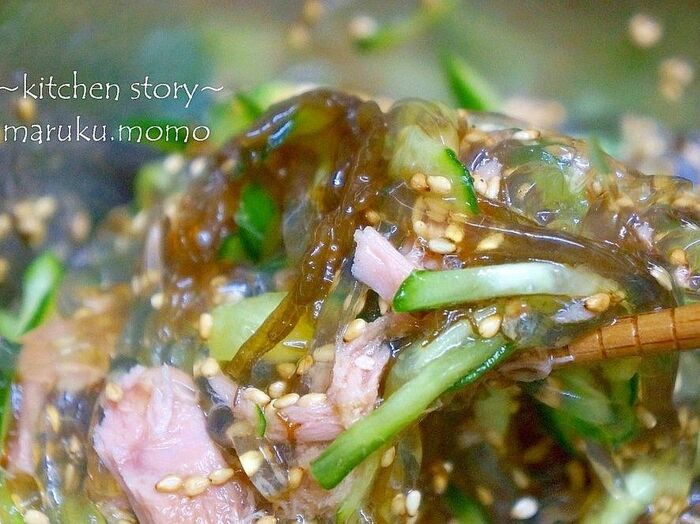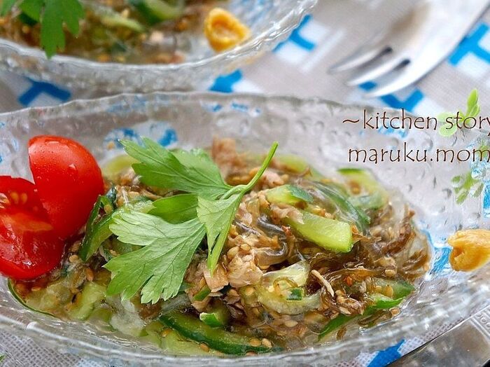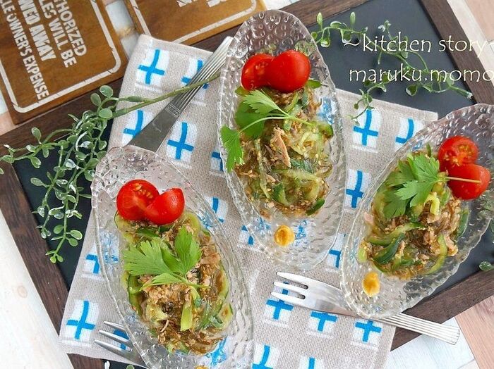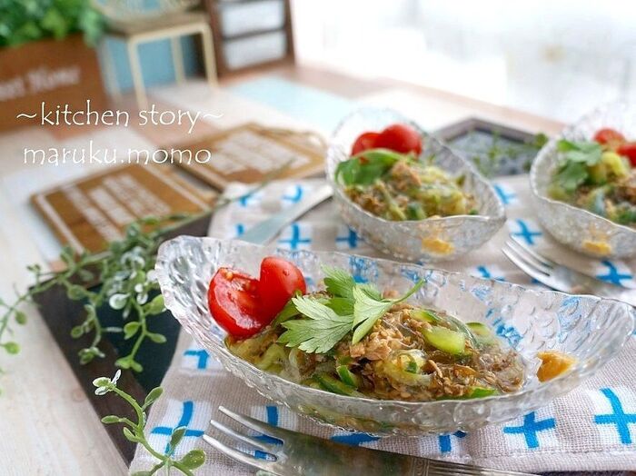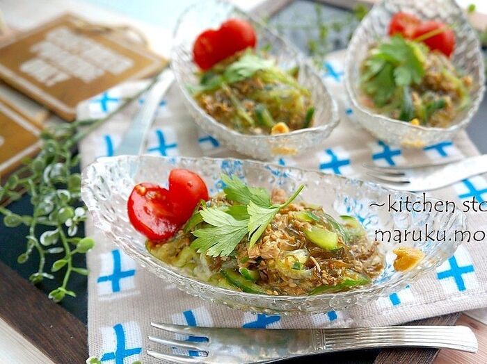 器に盛り、お酒のアテにも最高です!これからのアツい季節、喉ごしも良く冷たいサラダは食欲が無い時でもつるつる入って行きます。市販のところてんだけでは物足りないので、これにプラスして華やかな?ところてんにしました(pq*'v'*)♪