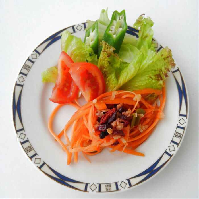 人参が美しくサラダに変身してフライドオニオンベリーでおめかしです。