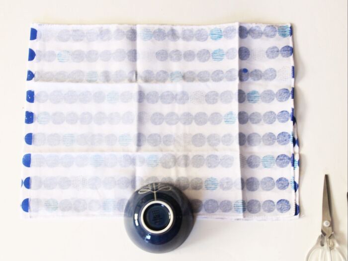 手ぬぐいを横長にして半分に切ります。