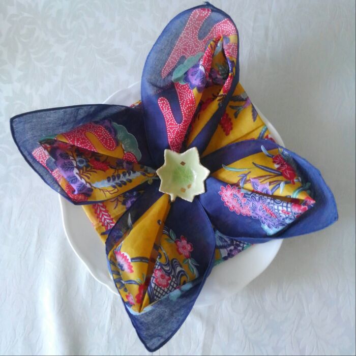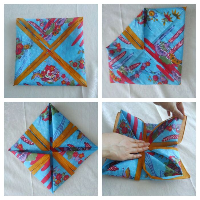 対角線上に合わせて布を△に4か所内側に折る→裏返す→また△に4か所の内側に折る→中心を押さえながら下のヒダを4か所内側から外側へ引っ張る。