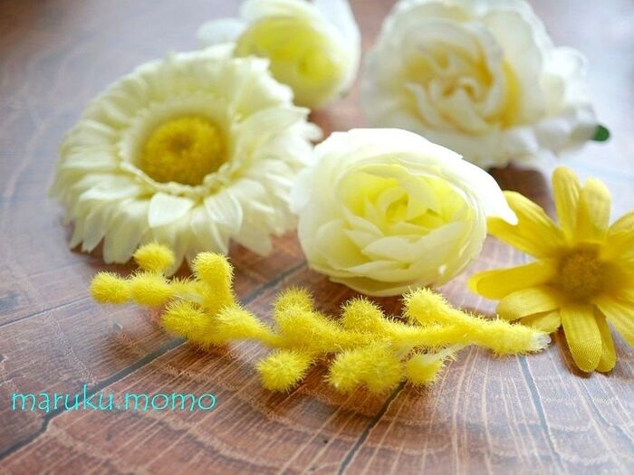 ローズ・ラナンキュラス・ユリオブステージ・ガーベラ・ミモザの種類が入っています。