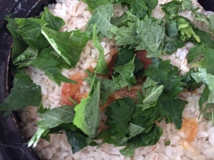 梅干しの種を取り シソをちぎって加えざっくりとかき混ぜる