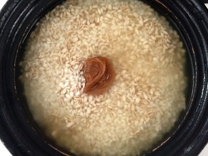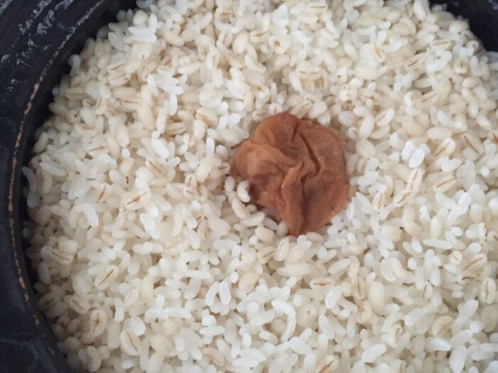 お米は洗って もち麦を加えかき混ぜ 梅干しを真ん中にのせ おだしをそそぐ