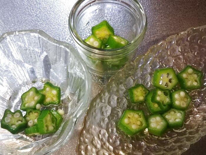 なめことオクラのゼリー寄せ(モロゾフのプリン容器)