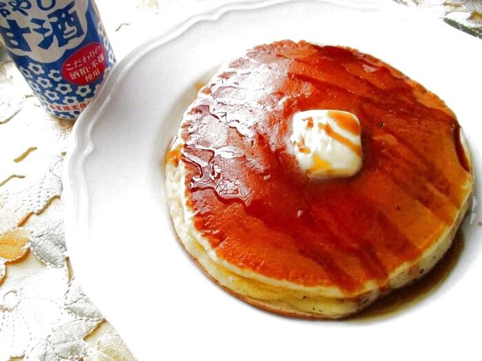 ②ホットケーキを焼きます、ポツポツと、穴が数個出てきたら、ひっくり返し時です、皿に移し、バターをのせ、黒蜜をたっぷりかけていただきます