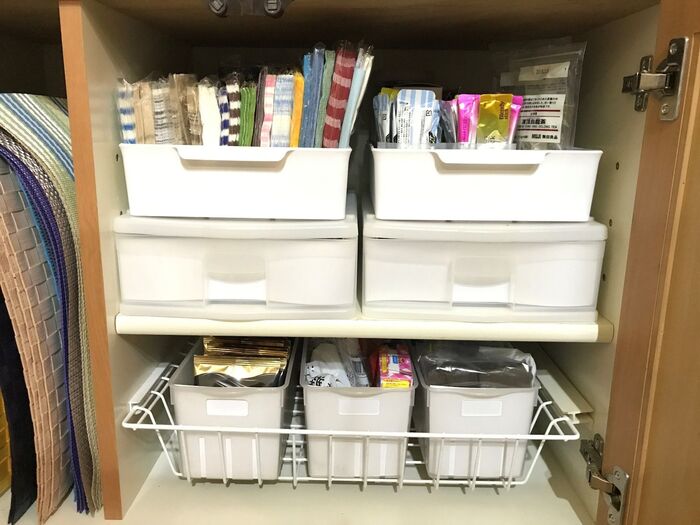 食器棚の下の部分に100円ショップのケースなどを利用して収納しています。