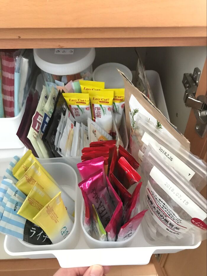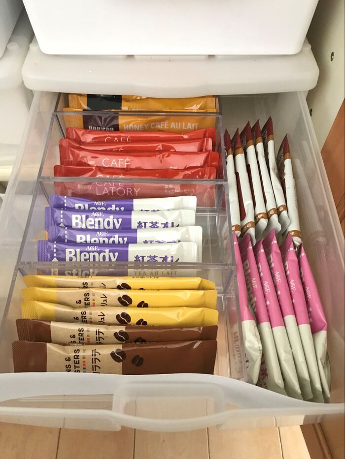 引出しの中は、こちらも100円ショップのケースで仕切ったカフェオレなどスティックタイプのものを。