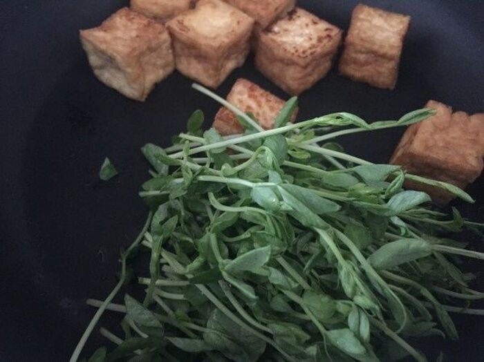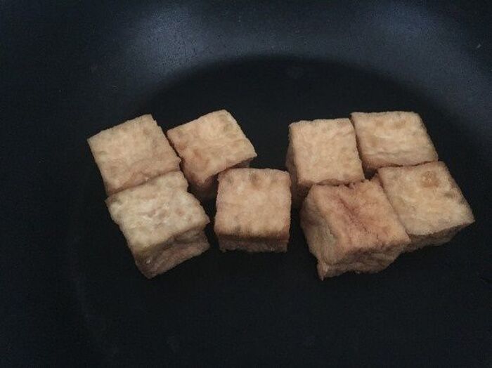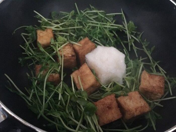 厚揚げをフライパンの隅に置きごま油小さじ1を加え食べやすい長さに切った