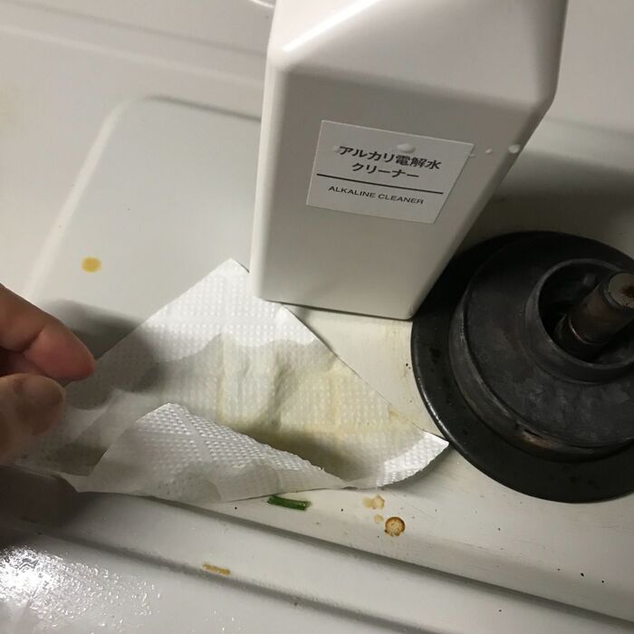 取れにくい汚れには、洗剤をシュシュっとして、キッチンペーパーで湿布。ゴシゴシ不要です。