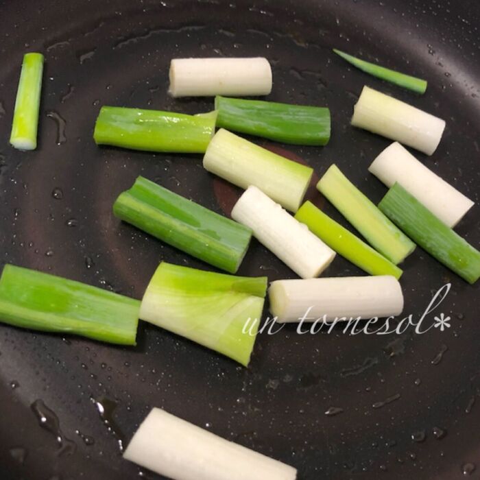 *長ネギを入れる前に、フライパンをキッチンペーパーで拭いてください。