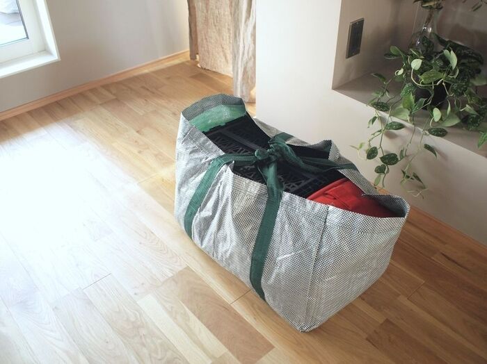 買い物バッグの中にコンテナを入れたとはいえ、余ったスペースに洋服などが入っているので、全体としては柔軟な形の荷物。