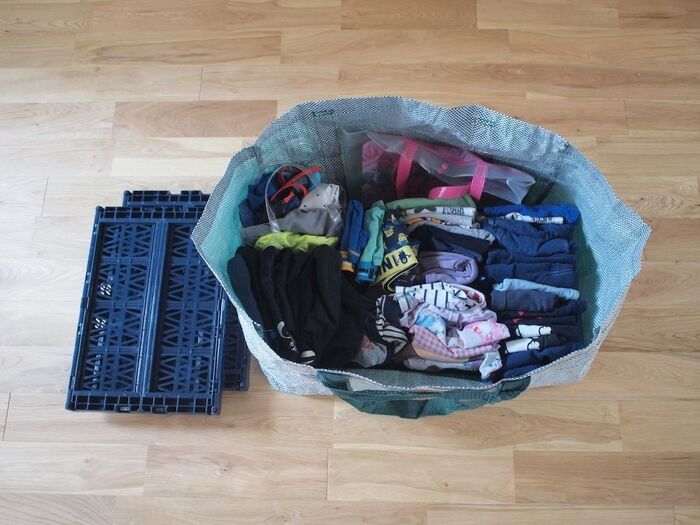 柔らかい買い物バッグ入れたコンテナの中に洋服を入れていきます。