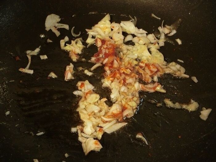 長葱と生姜をみじん切りにします。フライパンに油、長葱、生姜、豆板醤を入れて炒めます。