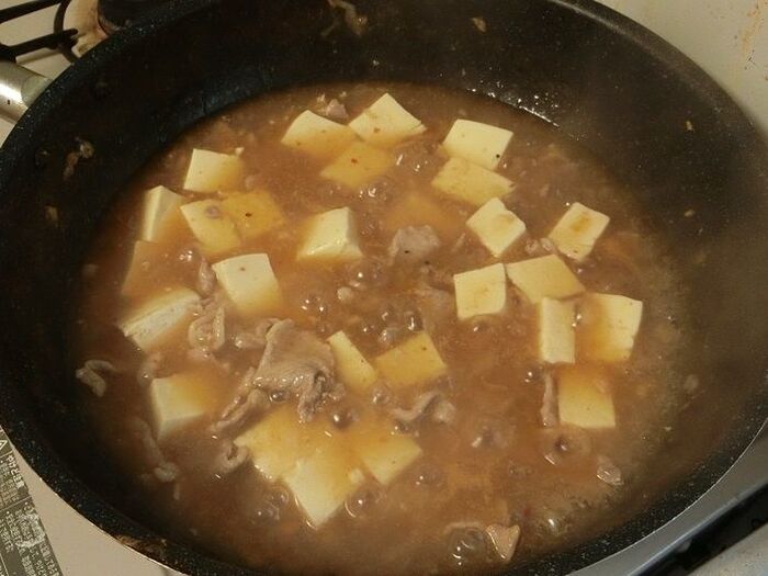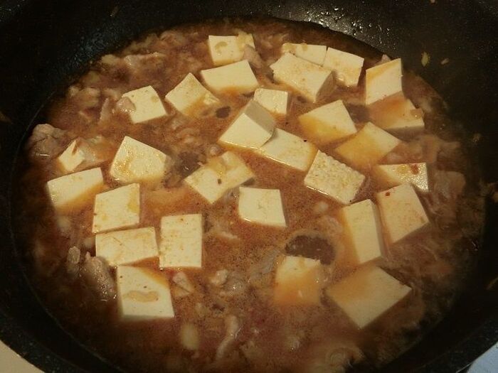 色が変わってきたら★印の材料を入れます。ぐつぐつしてきたら2㎝角に切った木綿豆腐を入れます。