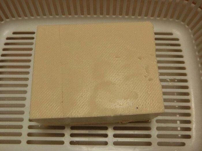 木綿豆腐はレンジで1分半加熱し、水切りします。