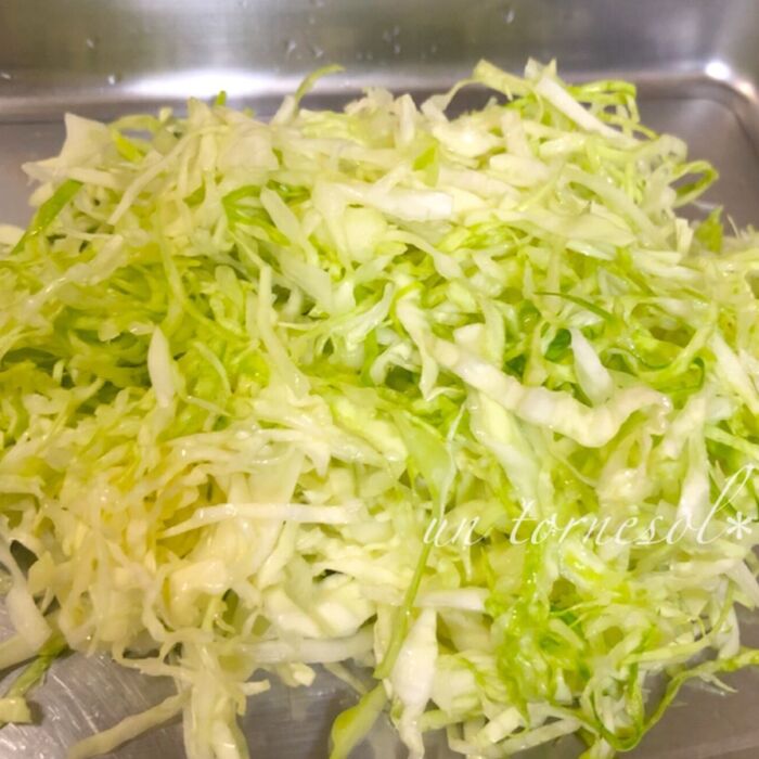 キャベツはせん切りに切り、塩もみをして約3〜4分経ったら、軽く絞っておく。