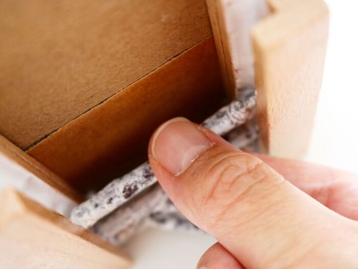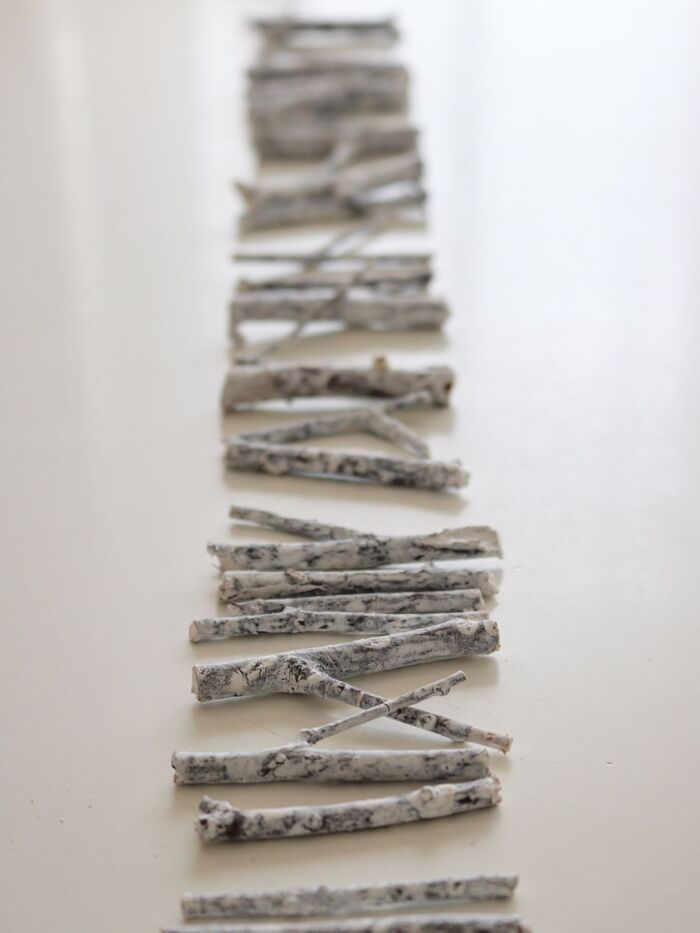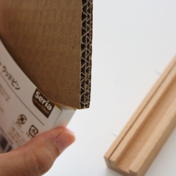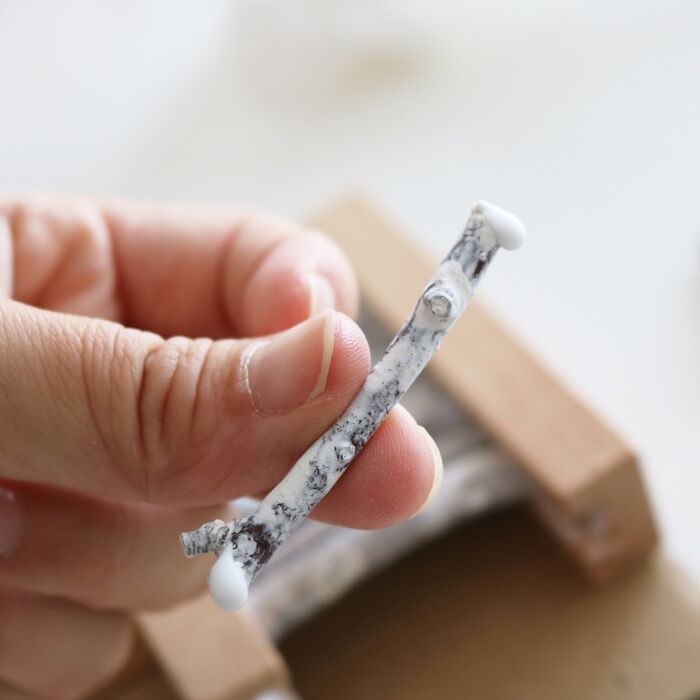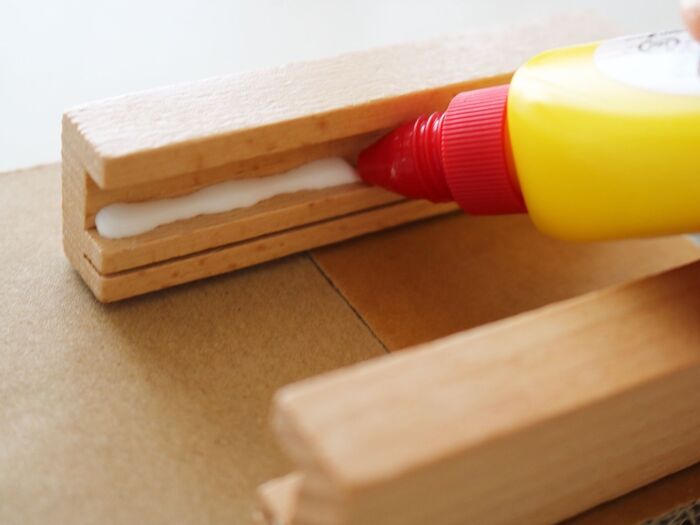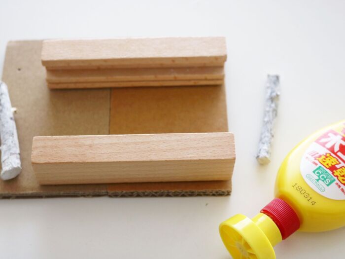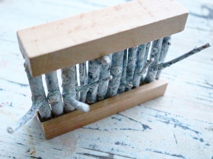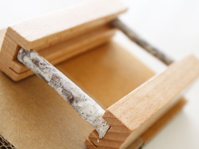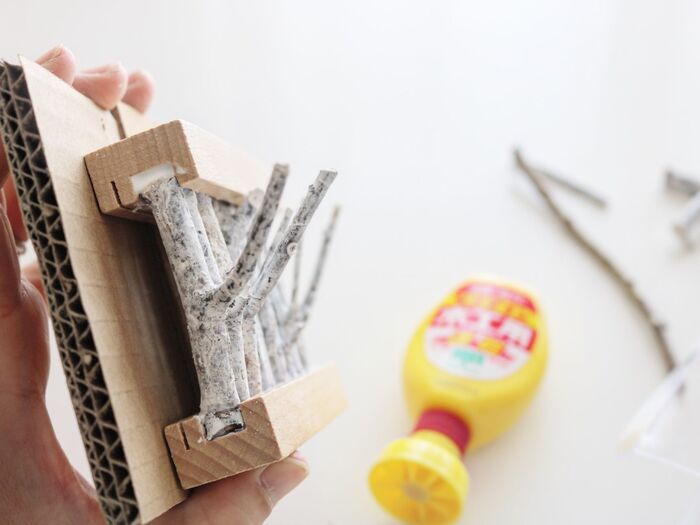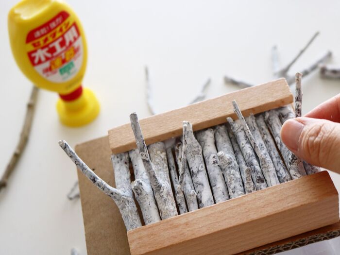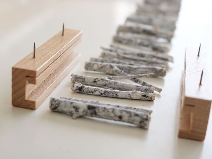 ウッドピンを向かい合わせにして、その広い溝に小枝をはさむように配置します。