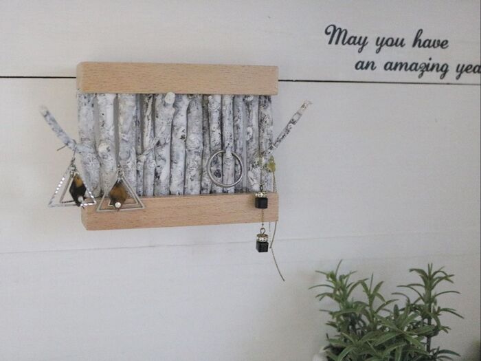 自然にできた枝分かれ部分にピアスやリングをかけて…
