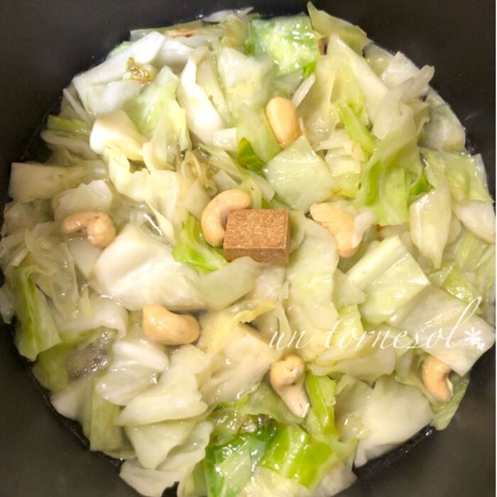 鍋に、オリーブオイルとキャベツを入れて油を絡めるように炒めて少ししんなりしたら、水とコンソメ・カシューナッツを入れて約5分煮込んで火を止める。《中火→中火〜弱火→止》