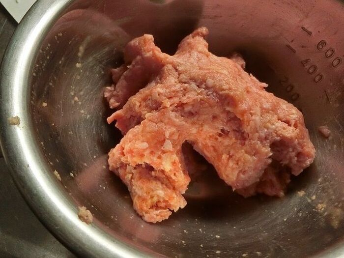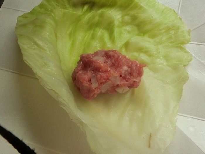そぎ落としたキャベツを細切りにし、8等分した肉だねと一緒に巻きます。巻き終わりをパスタで止めます。