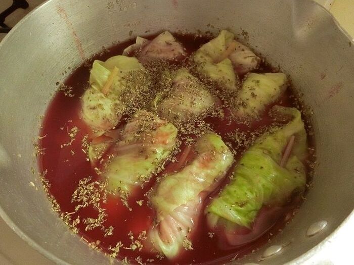 鍋にキャベツをならべ、水500cc、ボルシチの素(スパイス、調味液を入れて火にかけます。