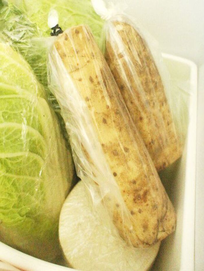 山芋は、ビニール袋へ入れ、ゴムで止めています。