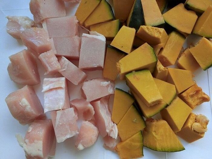 かぼちゃは3㎝角に切り、鶏胸肉は一口サイズに切ります。