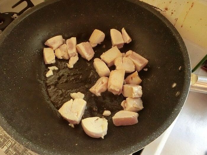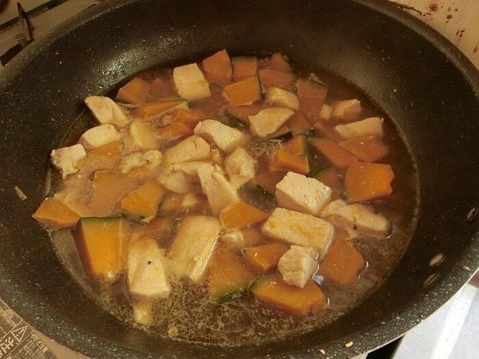 フライパンに米油と鶏胸肉を入れて炒めます。焼き色が付いたらかぼちゃを入れ、さっと炒め合わせます。