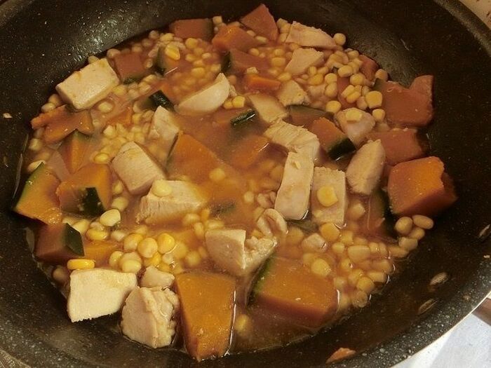 コーンを加え、全体を混ぜながら汁気がなくなるまで煮たら完成♪