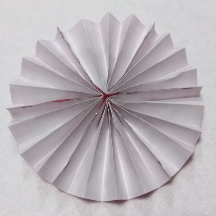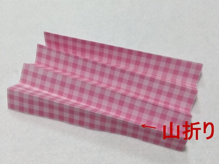 折り紙を開き、表面に向け、折り目に沿ってジャバラに折っていきます。