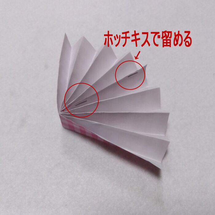 裏面に返し、赤丸部分にホッチキスで接合させます。