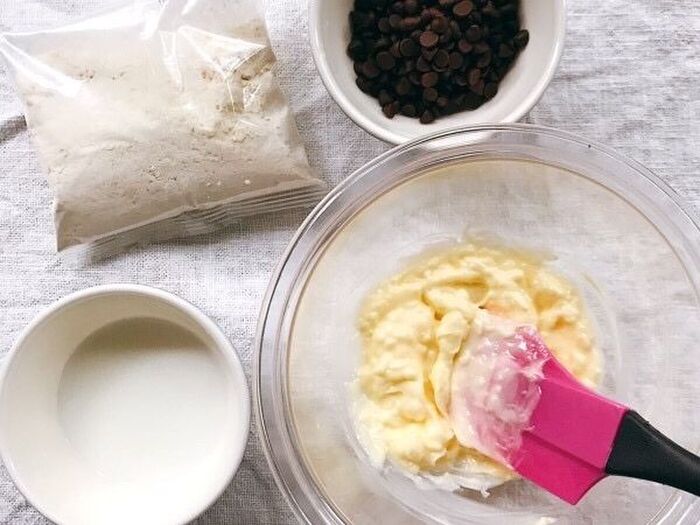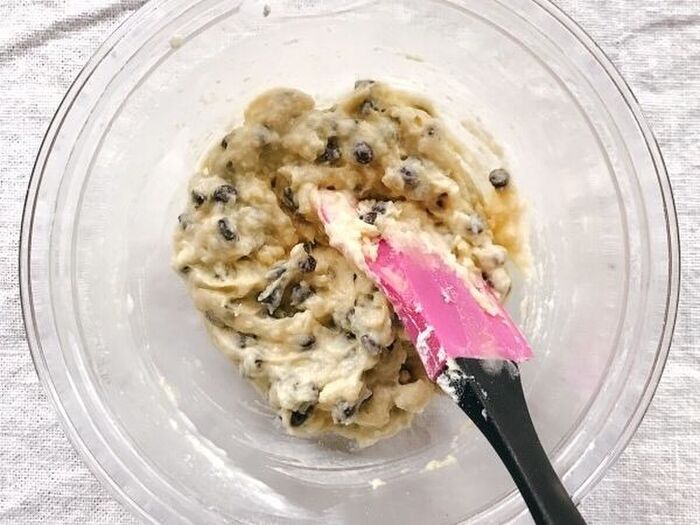 3.粉っぽさがなくなったら牛乳とチョコチップを加えて更に混ぜる(生地完成)。