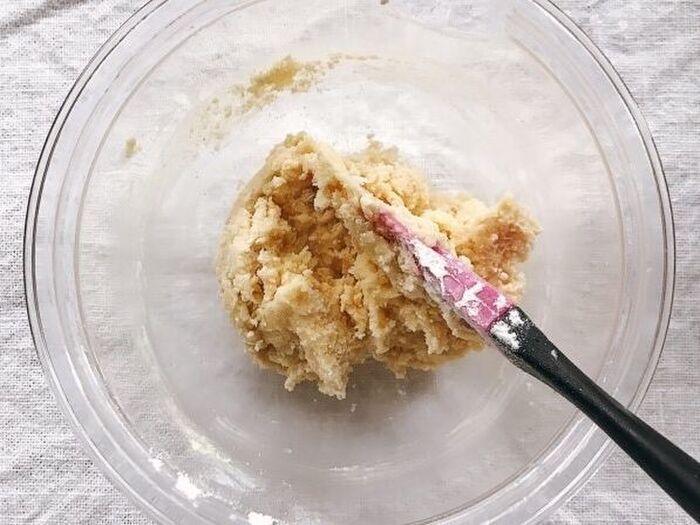 2.ボウルにバターを入れて柔らかく練り、ホットケーキミックスを加えてゴムべらでさっくり混ぜる。