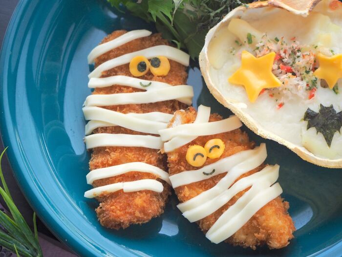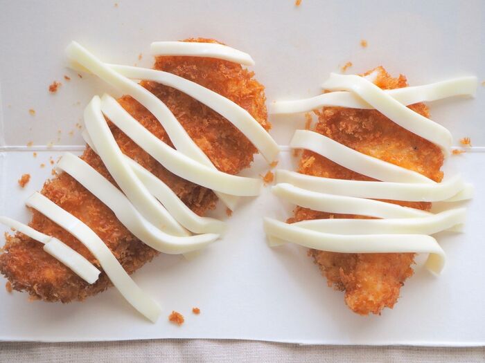 5、カツにカットしたチーズを包帯のようにのせて、はみ出した部分をキッチンバサミでカットします。