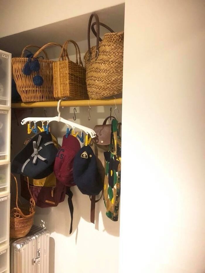 *以前は帽子を収納カゴに入れてしまっていましたが、小物干しに収納することで、出し入れ簡単で楽ちんになりました。
