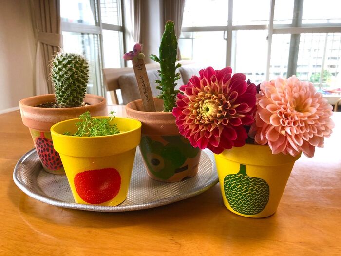 食卓には、アルミのお盆を置いて、そこに植木鉢を並べました。