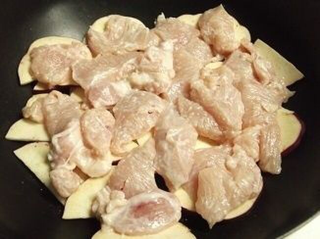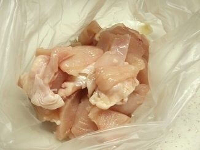 一口大にそぎ切りした鶏むね肉を入れ