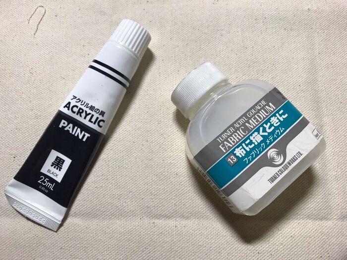 ステンシルは普段、アクリル絵の具のみを使用してやってますが、布製品は洗うので、アクリル絵の具だけでも大丈夫ですが、念には念をで、、