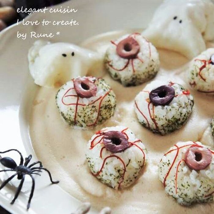 メレンゲをお皿に広げて表面をならしたらおにぎり目玉をのせて完成。