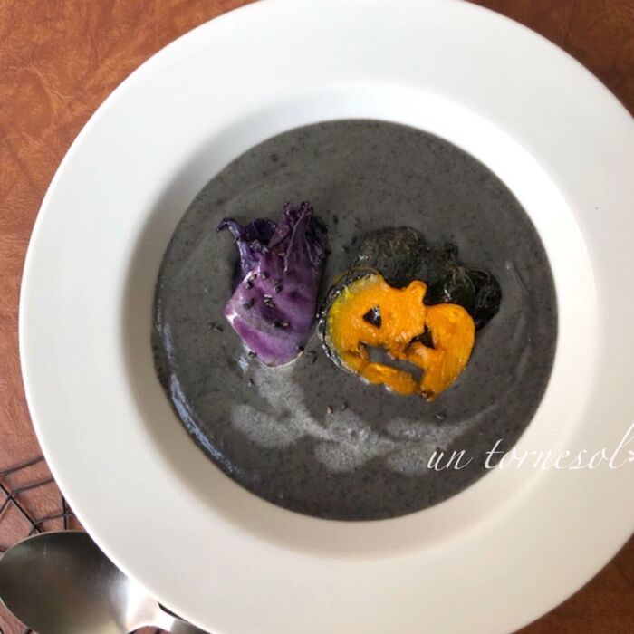 あら熱が取れたら、残りの水と一緒にミキサー(ブレンダーなど)で滑らかになるまで撹拌し、鍋に戻して黒ねりごまと牛乳を入れて加熱し、塩・胡椒で味を整えれば完成‼︎《弱火》