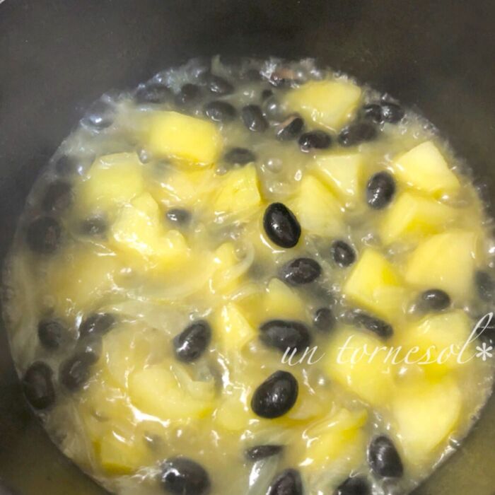 じゃがいもと鶏がらスープの素・水の半量を入れ、フタをしてじゃがいもが柔らかくなるまで煮て、ある程度じゃがいもが柔らかくなったら黒豆を入れてさらに煮る。《中火》